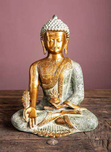 Buddha aus Messing Farbe: Gold antik, patinagrün Größe: Größe: 31,5 Gewicht: 5,6