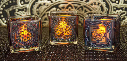 Teelichtglas - Blume des Lebens Als Symbol der kosmischen Ordnung hilft sie dabei, uns zu erinnern, wer wir wirklich Glas mit je 4 gleichen Symbolen, L: 6 cm. Kommt in hübscher Geschenkbox. Lieferung ohne Teelicht.