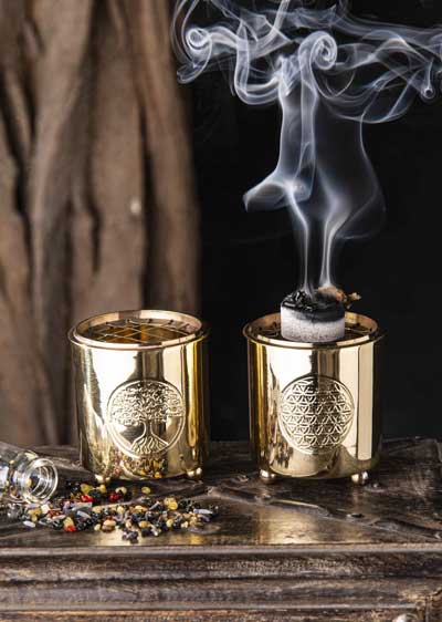 Halter rund, Lebensblume Zauberhafter Stäbchenhalter mit 7 Emblemen. Aluminium im Kupfer Antik Finish mit aufgesetzten goldfarbenen Symbolen. ø 10,5 cm